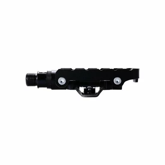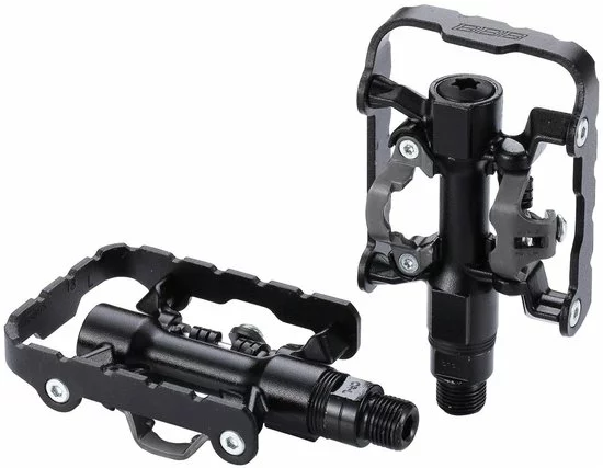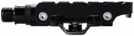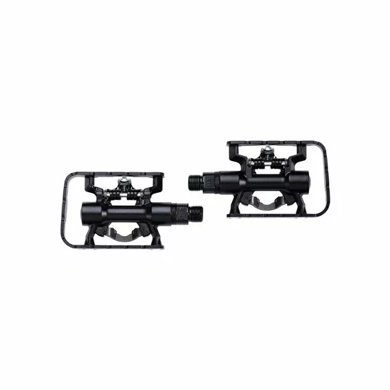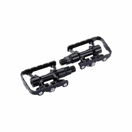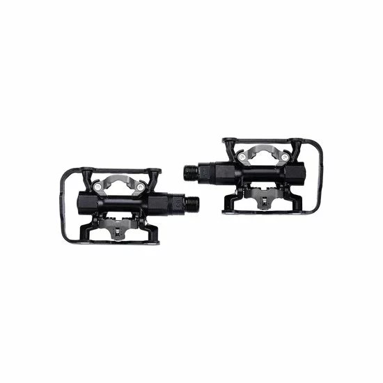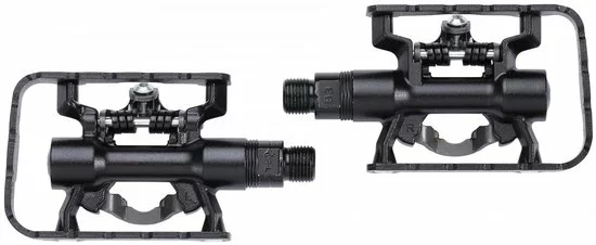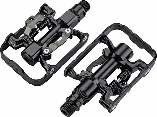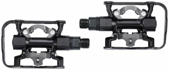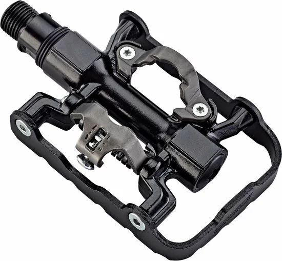Pedaal met dubbel functie. E?n kant met een SPD-compatibel klikmechanisme en de andere kant een aluminium kooi met een anti-slip laag voor normale schoenen.