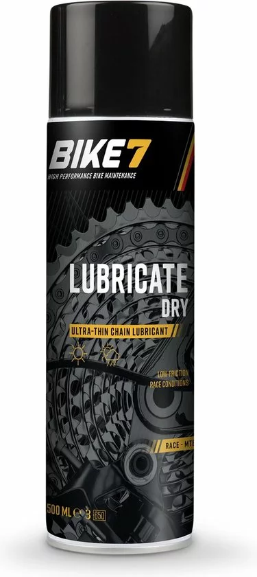 Lubricate is een transparant smeermiddel met PTFE om langdurige smering te garanderen. Bike7 Lubricate Dry is een ultradun smeermiddel met een hoog penetrerend vermogen voor dieptesmering. De Dry versie is minder klevend dan de Lubricate Wet.