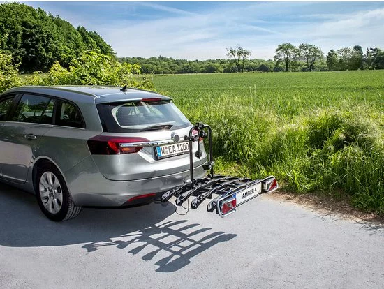 Gedeeltelijk voorgemonteerde fietsendrager voor het transporteren van 4 fietsen op de trekhaak. Ook geschikt voor fietsen met oversized en Y-frames en voor e-bikes. Eenvoudige montage met snelsluitsysteem. De wielen zijn vastgezet met framehouders en textiel spanbanden.