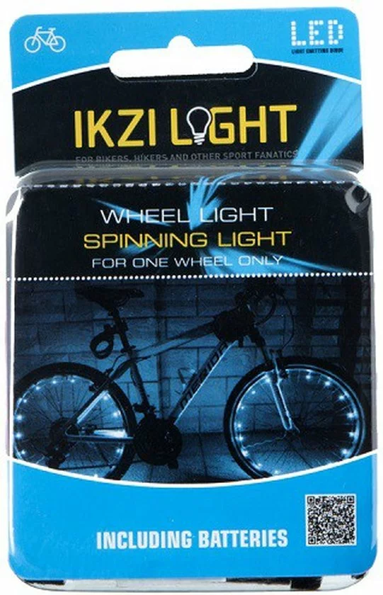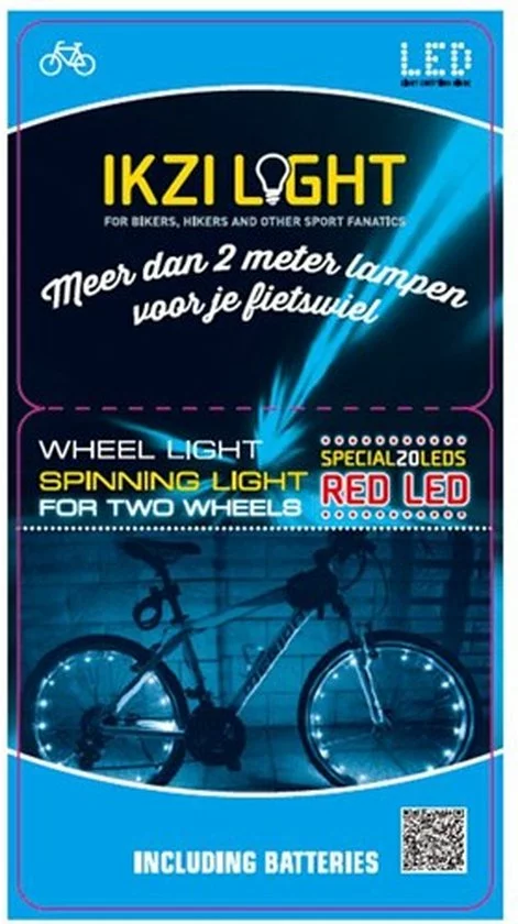 IKZI spaaklicht 2x 20 led rood Geschikt voor 2 wielen. Wordt geleverd met 6 AAA batterijen. De spaakverlichting van IKZI wordt geleverd in een blister.