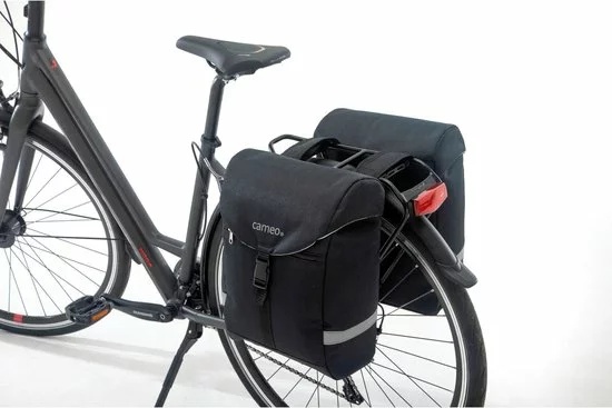 De Cameo Sports dubbele fietstas is gemaakt van waterdicht polyester. Doordat de klep over de tas heen valt is de tas goed waterafstotend voor kleine regenbuien. Wil je ook de zwaardere regenbuien doorstaan? Dan raden wij aan om een New Looxs regenhoes voor dubbele fietstassen erbij te kopen. Daarmee maak je iedere tas waterdicht.