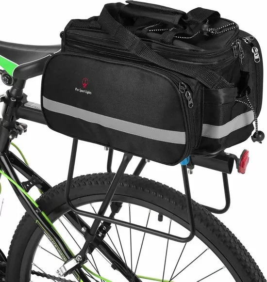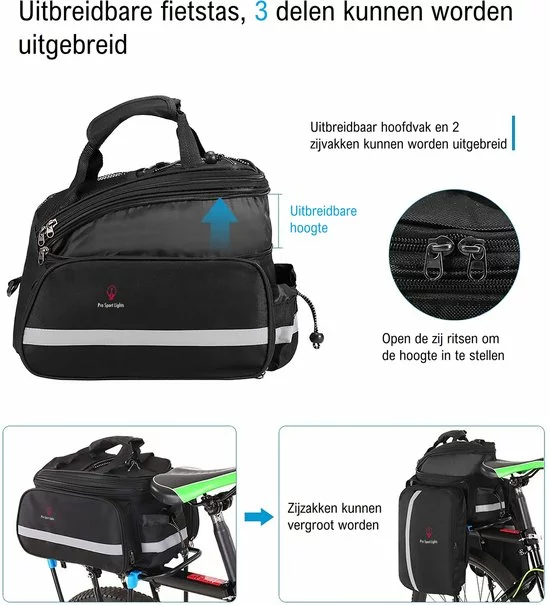 - ? Uitbreiding aan de zijtas: de XXL Pro Sport Lights fietstas ondersteunt geavanceerde functies aan beide zijden om aan meer capaciteit te voldoen. Indien niet nodig sluit dan de ritssluiting. Aan de bovenkant van de fietstas bevindt zich een netvak met een krimpriem, die extra fietsaccesoires kan meedoen!