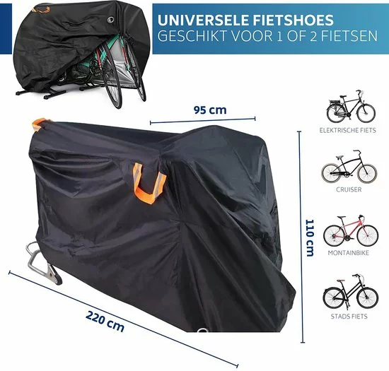 De hoes is 220 x 95 x 110 CM en beschikt over een elastische band. Geschikt voor nagenoeg elke fietsgrootte. De hoes past ook op fietsen met babyzitjes en fietstassen. Past op zowel 1 fiets als 2 fietsen naast elkaar.