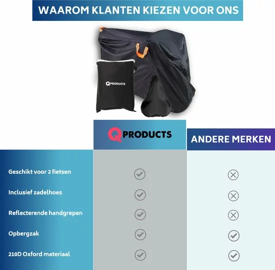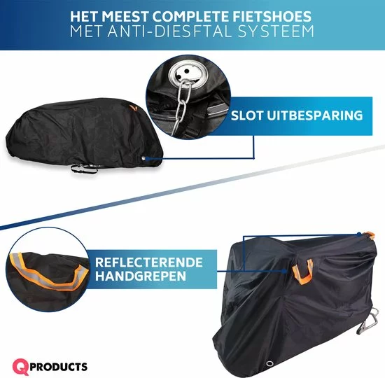 Wij hebben de ideale oplossing voor wie op zoek is naar de optimale bescherming voor zijn fiets voor een langere levensduur. Het beschermkleed van Qproducts is gemaakt van hoogwaardig en scheurbestendig 210D Oxford. Qproducts biedt de perfecte hoes bescherming tegen alle weer omstadigehden. 210D Oxford is tot wel 2x sterker dan de standaard hoes. Dankzij de gecoate binnenzijde en de thermisch gelaste naden is het zeil absoluut waterdicht. Door de ge?ntegreerde elastische band met riem en Quick-Lock kan deze hoes van Qproducts strak aan de fiets worden bevestigd voor een ideale pasvorm.