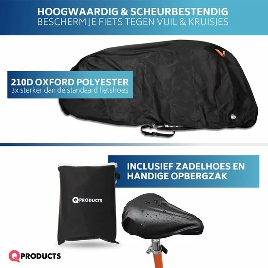 Gemaakt met extreem sterk 210D Oxford beschermt de Qproducts hoes je fiets tegen vuil, krasjes, water en het weer. De hoes is licht, makkelijk mee te nemen en duurzaam.