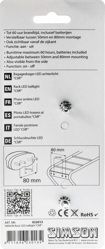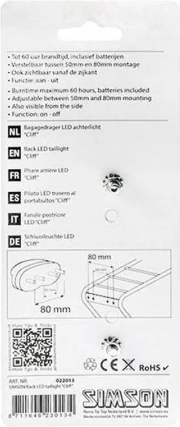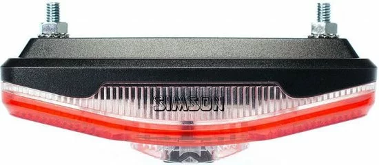Dit Simson achterlicht Cliff is van hoogwaardige kwaliteit. Het achterlicht heeft een modern design met ge?ntegreerde reflector. De krachtige rode led geeft een heldere lichtuitstraling voor optimale zichtbaarheid, zelfs aan de zijkanten van de fiets. Het achterlicht heeft een brandtijd tot maar liefst 60 uur. Het licht is 100% spat- en regenwaterdicht voor een optimale levensduur. De afstand tussen de boutjes is verstelbaar tussen de 50 mm en 80 mm. Het achterlicht heeft een drukschakelaar om aan en uit te zetten.